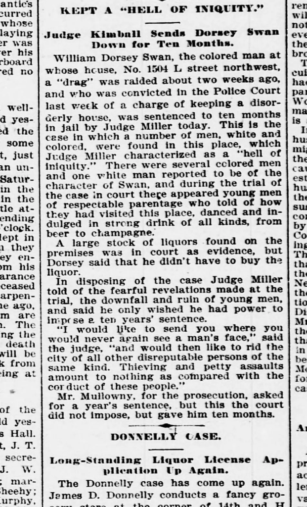 Swann was born in Hancock, Maryland in the March of 1860, the fifth of 13 children. At birth, he was enslaved. After the Civil War, his parents were able to buy a farm. He did not go to school, as he had to work as early as possible. His first job was as a hotel waiter. Swann was caught stealing books from the Washington Library Company, and an item from his employers’ home, in 1884. He pled guilty and was sentenced to six months in jail, but his former employers, the sentencing judge, and the Assistant US Attorney supported a presidential pardon for him. They argued he was “industrious”, “refined”, “gentle”, and “courteous”. Records to not actually indicate if the pardon was ever granted. But he was offered permanent employment as the college janitor. But then, things changed. He travelled to Washington D.C. in 1880. Swann began organizing drag balls in the city. Most of the participants were formerly enslaved men like Swann, gathering to dance in silk and satin dresses.