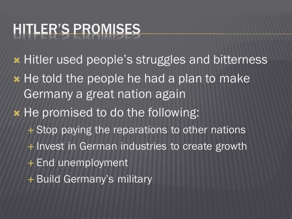 Hitler promised that any worker would be able to feed his family. He pandered to an economically weakened population with the restoration of Germany to it’s once great form, to make Germany great again. He targeted voiceless pockets of the population and blamed them, not the “hard-working” Germans for their plight. This effort got his party elected into control of their democracy. He held huge rallies and generated a lot of excitement for a brighter future.