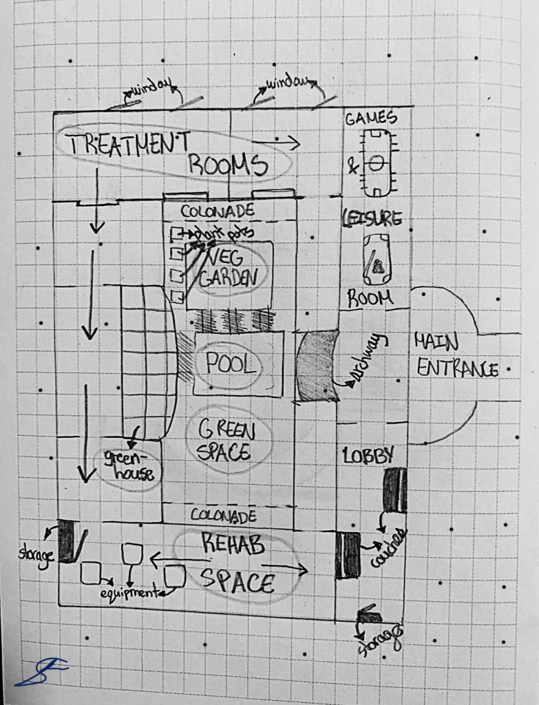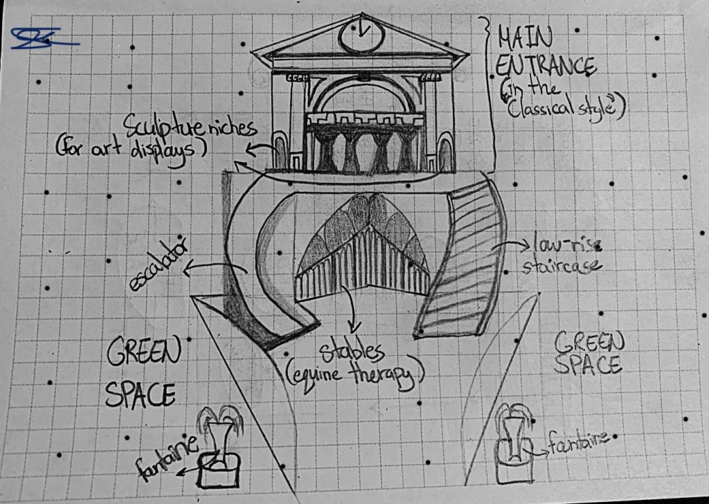 What I’d like to highlight is the underlying spirit of physical functionality and aesthetic harmony in history. This could be revived for modern building and space designs. As Vitruvius says the building has to be functional, which today would mean being accessible to bodies of all abilities. Many ancient societies across the world also believed that symmetry and geometric patterns were not only divine but harmonious in a pleasing way to the mind and soul. From this I’ve pieced together a hypothetical space that could fulfill the needs of the mind, body and soul.
