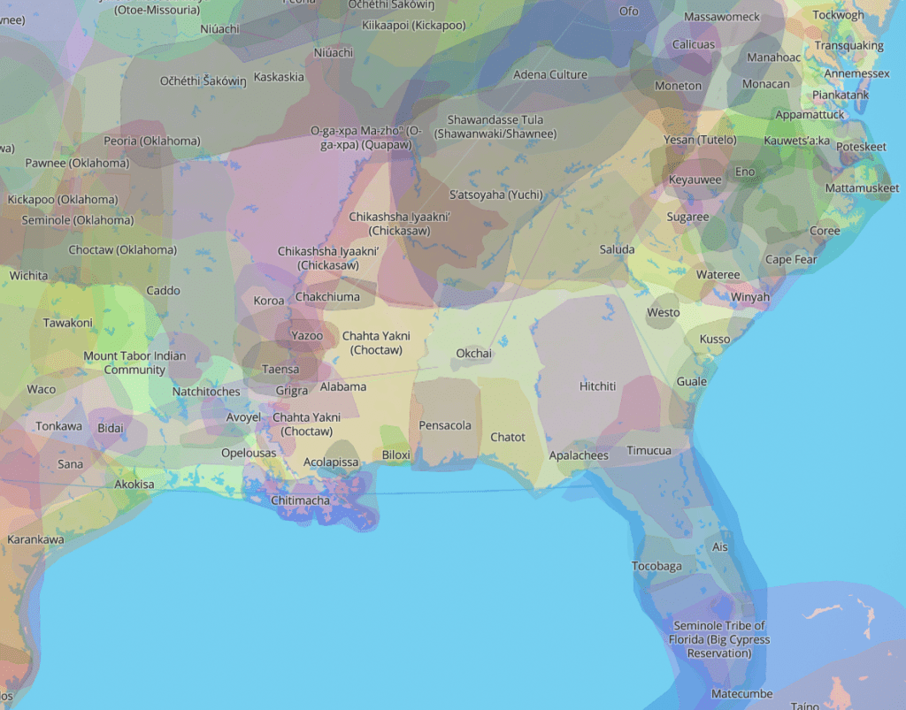 The region we now call the Southeastern United States, or the South, is about the same as the “Southeastern Woodlands”. This term describes a cultural region of Native Americans that existed prior to colonization and imperialism. The region stretches from Houston to Richmond, and from Miami to the Missouri Bootheel. Indigenous ethnic groups, tribes, and nations of this region include, but are not limited to, the: